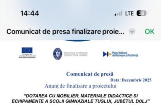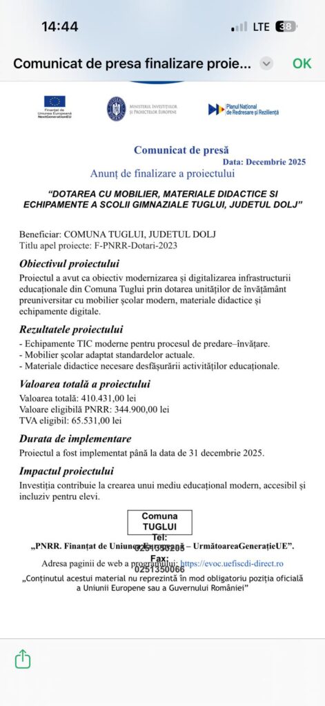 Proiectul a avut ca obiectiv modernizarea și digitalizarea infrastructurii educaționale din Comuna Tuglui prin dotarea unităților de învățământ preuniversitar cu mobilier școlar modern, materiale didactice și echipamente digitale.