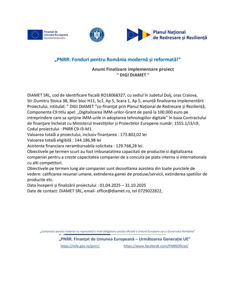 DIAMET SRL, cod de identificare fiscală RO18068327, cu sediul în Judetul Dolj, oras Craiova, Str. Dumitru Stoica 38, Bloc bloc H11, Sc1, Ap 5, Scara 1, Ap 5, anunță finalizarea implementării Proiectului, intitulat: ” DIGI DIAMET ”co-finanţat prin Planul Național de Redresare și Reziliență, Componenta C9 titlu apel: „Digitalizarea IMM-urilor-Grant de pană la 100.000 euro pe intreprindere care sa sprijine IMM-urile in adoptarea tehnologiilor digitale” în baza Contractului de finanţare încheiat cu Ministerul Investițiilor și Proiectelor Europene număr: 1555.1/i3/c9, Codul proiectului: PNRR C9-I3-M1.