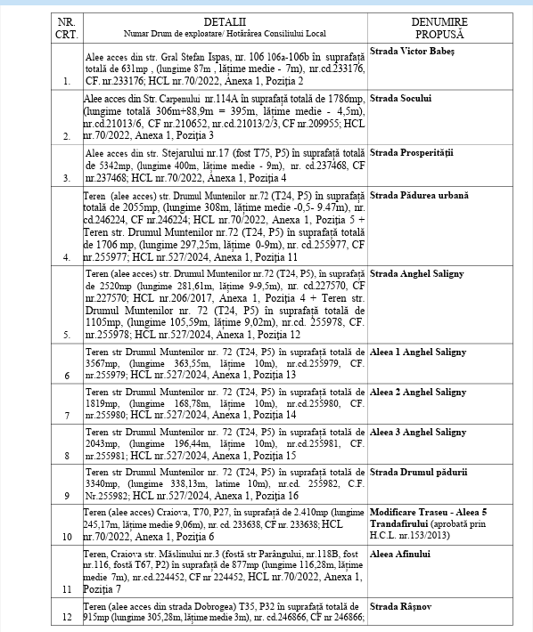 Într-o frază mai stufoasă decât „Pădurea urbană“ de care vorbeşte primăria, municipalitatea explică demersul de a crea noi nomenclaturi stradale. „Având în vedere Procesul verbal de delimitare a unităților administrativ-teritoriale Craiova-Șimnicu de Sus nr.158854/2021, a Procesului verbal de delimitare a unităților administrativ-teritoriale Craiova-Podari nr.6306/2022, prin care au fost stabilite noi limite administrativ-teritoriale si prin care au fost declarate de uz şi interes local, o serie de drumuri/străzi, precum şi a solicitărilor adresate de către cetăţenii care au donat Municipiului Craiova alei ce deservesc accesul la proprietăţi, a impus actualizarea Inventarului domeniului public al Municipiului Craiova prin introducerea/actualizarea acestuia cu noi căi de acces ce deservesc proprietăţi aflate în intravilanul muncipiului şi pentru care este necesară stabilirea de numere factoriale, precum şi identificarea unor căi de acces deja existente în domeniul public al Municipiului Craiova, dar pentru care nu au fost atribuite denumiri distincte, se impune atribuire de denumiri de străzi ce vor completa Nomenclatorul Stradal al Municipiului Craiova şi care, împreună cu numerele factoriale alocate ulterior de către aparatul de specialitate Direcţia de Urbanism şi Amenajarea Teritoriului prin Serviciul Urbanim şi Nomenclatură Urbană, vor constitui adresele proprietăţilor al căror acces se realizează din aceste căi de acces“.