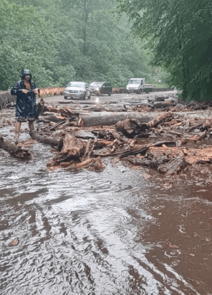 Traficul rutier este blocat pe DN 7C, la kilometrul 95+700 metri, în zona localității Arefu, județul Argeș, după ce mai multe viituri au ajuns pe partea carosabilă.
