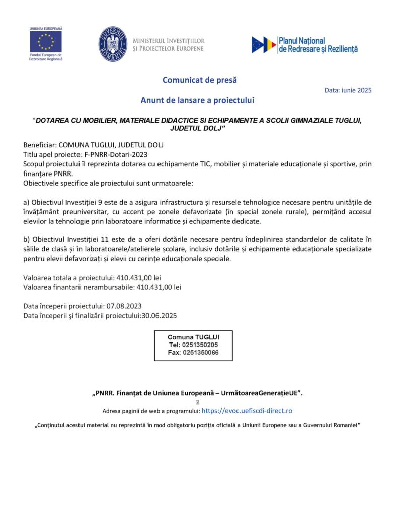 Anunt de lansare a proiectului “Dotarea cu mobilier, materiale didactice și echipamente a Școlii Gimnaziale Țuglui, județul Dolj”