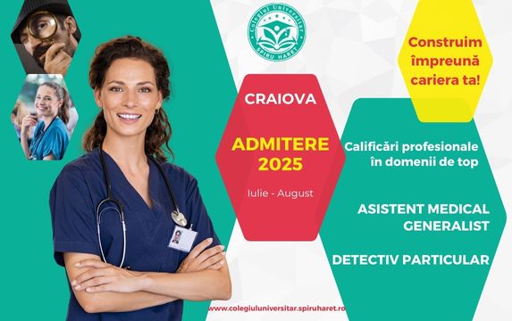 Până la data de 31 august 2025, Colegiul Universitar Spiru Haret din Craiova organizează, Admitere pentru anul școlar 2025 – 2026 la două calificări profesionale în domenii de top: Asistent medical generalist și Detectiv particular.