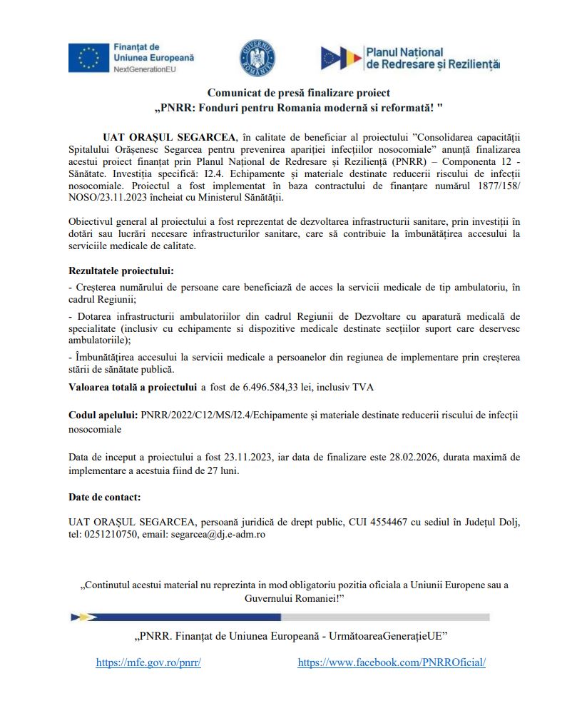 UAT ORAȘUL SEGARCEA, în calitate de beneficiar al proiectului ”Consolidarea capacității Spitalului Orășenesc Segarcea pentru prevenirea apariției infecțiilor nosocomiale” anunță finalizarea acestui proiect finanțat prin Planul Național de Redresare și Reziliență (PNRR) – Componenta 12 – Sănătate. Investiția specifică: I2.4. Echipamente și materiale destinate reducerii riscului de infecții nosocomiale.