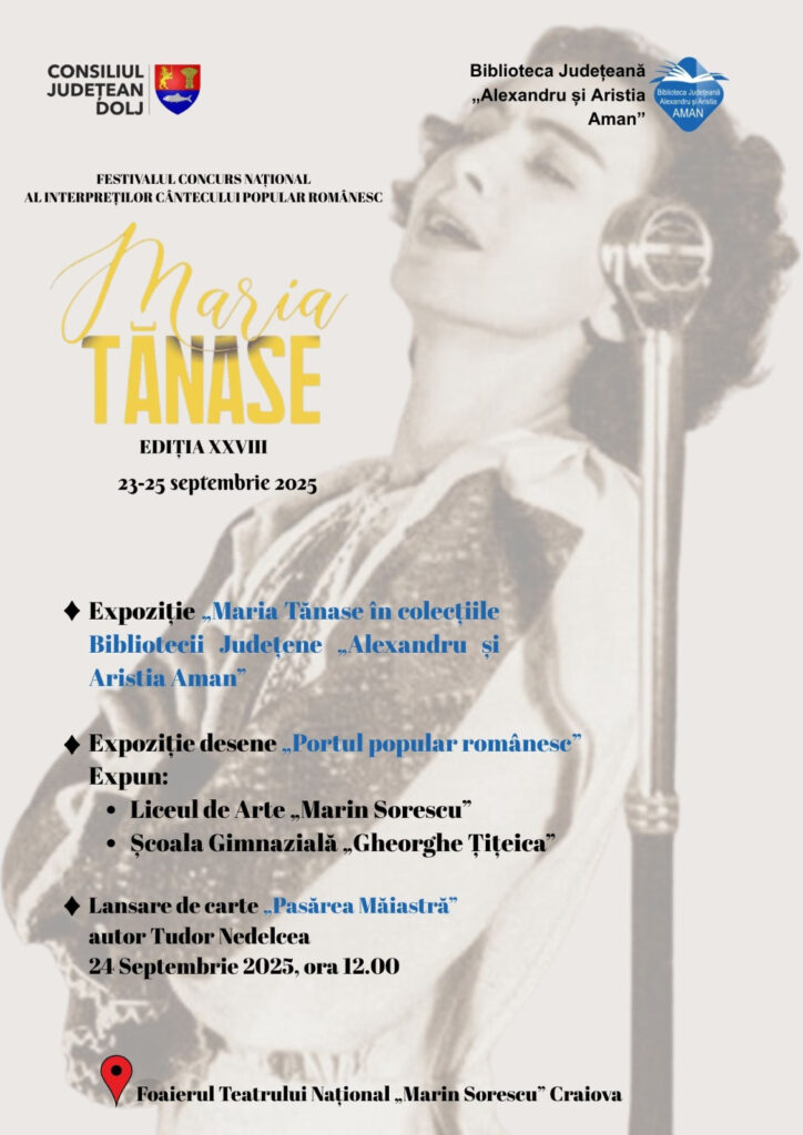 Biblioteca Județeană „Aman” se alătură celei de-a XXVIII-a ediții a Festivalului – Concurs Național al Interpreților Cântecului Popular Românesc „Maria Tănase”. Evenimentul se va desfășura la Craiova, în perioada 23 – 25 septembrie.