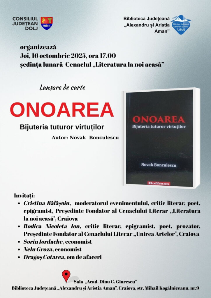Biblioteca Aman găzduiește, joi, lansarea volumului „Onoarea. Bijuteria tuturor virtuțiilor”, autor Novak Bonculescu.