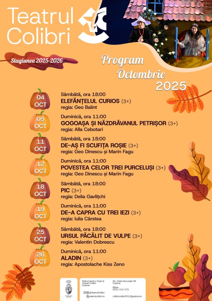 Teatrul Colibri Craiova invită micii spectatori și părinții lor să participe la două reprezentații speciale în primul weekend din luna octombrie.