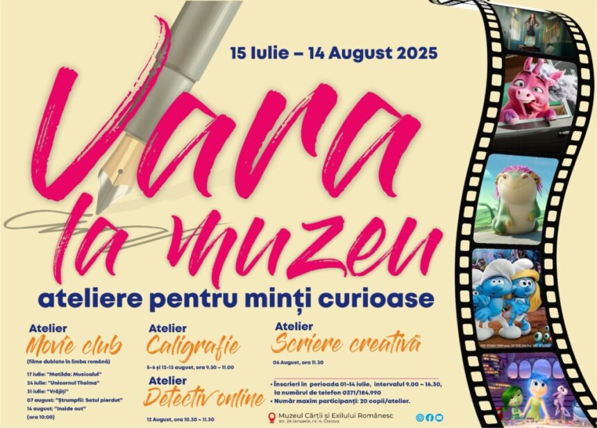Astfel, în perioada 15 iulie-14 august, muzeografii și voluntarii parteneri ai Muzeului Cărții și Exilului Românesc vor organiza o serie de patru ateliere educative și distractive pentru cei mici: Movie Club, Atelier de Caligrafie, Atelier Detectiv Online și Atelier de Scriere Creativă.