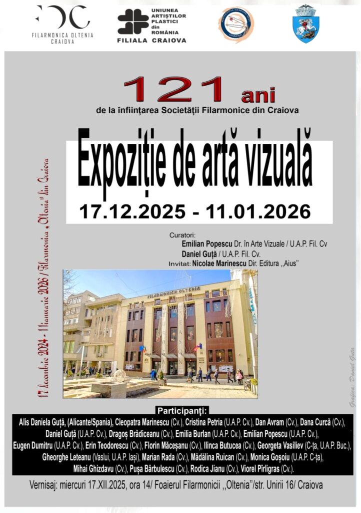 În suita evenimentului 121 ani de la înfiinţarea Societăţii Filarmonice din Craiova, sub auspiciile Primăriei Craiova și Consiliului Local, ale Filialei Dolj a Uniunii Artiştilor Plastici din România, în parteneriat cu Filarmonica „Oltenia”, Asociaţia Seniori Art Craiova prezintă: Expoziţie de artă vizuală.