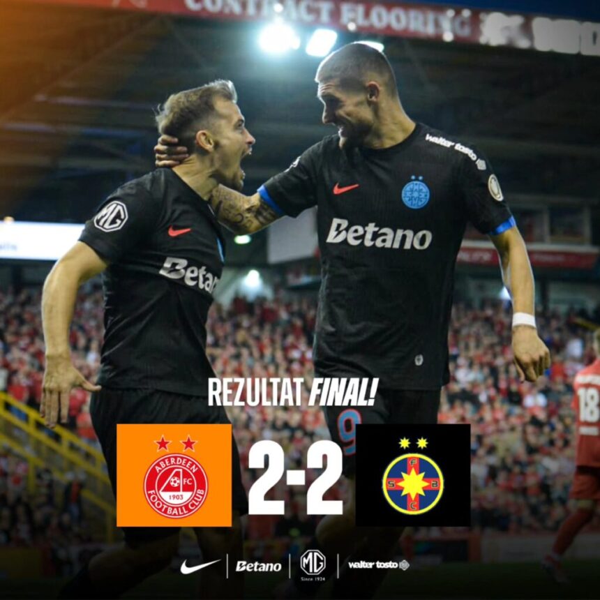 FCSB a terminat la egalitate cu echipa scoțiană Aberdeen FC, scor 2-2, joi seară, pe „Pittodrie Stadium“ din Aberdeen, în prima manșă a play-off-ului Europa League la fotbal.