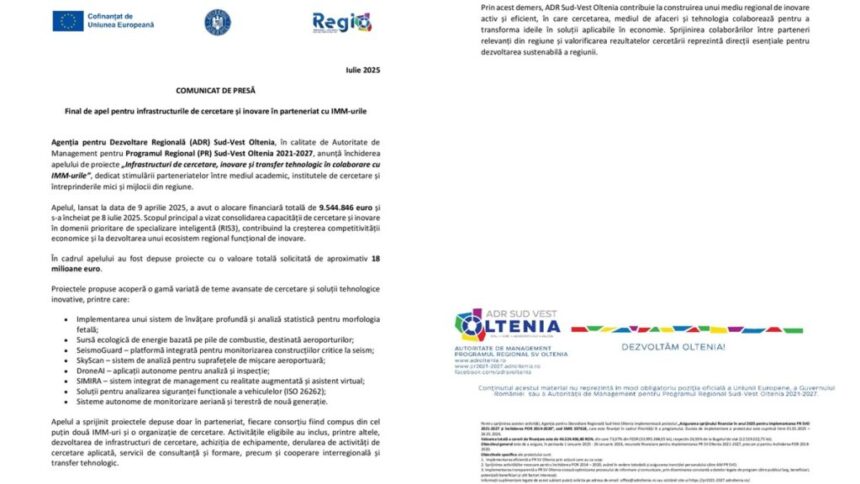 Agenția pentru Dezvoltare Regională (ADR) Sud-Vest Oltenia, în calitate de Autoritate de Management pentru Programul Regional (PR) Sud-Vest Oltenia 2021-2027, anunță închiderea apelului de proiecte „Infrastructuri de cercetare, inovare și transfer tehnologic în colaborare cu IMM-urile”, dedicat stimulării parteneriatelor între mediul academic, institutele de cercetare și întreprinderile mici și mijlocii din regiune.