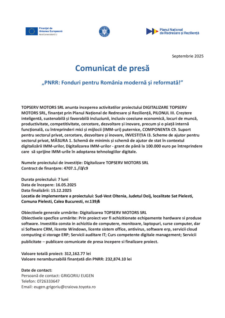 TOPSERV MOTORS SRL anunta inceperea activitatilor proiectului DIGITALIZARE TOPSERV MOTORS SRL, finanțat prin Planul Național de Redresare și Reziliență, PILONUL III. Creștere inteligentă, sustenabilă și favorabilă incluziunii, inclusiv coeziune economică, locuri de muncă, productivitate, competitivitate, cercetare, dezvoltare și inovare, precum și o piață internă funcțională, cu întreprinderi mici și mijlocii (IMM-uri) puternice, COMPONENTA C9. Suport pentru sectorul privat, cercetare, dezvoltare și inovare, INVESTIȚIA I3. Scheme de ajutor pentru sectorul privat, MĂSURA 1. Schemă de minimis și schemă de ajutor de stat în contextul digitalizării IMM-urilor, Digitalizarea IMM-urilor – grant de până la 100.000 euro pe întreprindere care să sprijine IMM-urile în adoptarea tehnologiilor digitale.