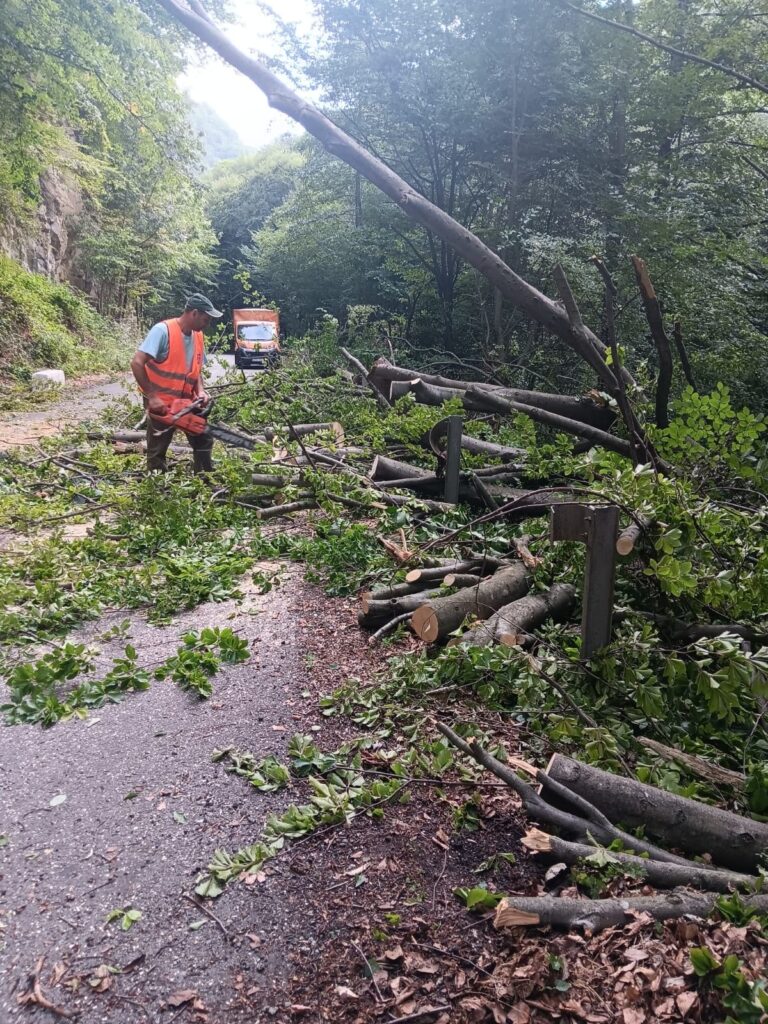 Angajații SDN Orșova au intervenit miercuri seară, pe DN 67D, în zona Godeanu, pentru a îndepărta de pe carosabil copacii rupți de furtună, a anunțat DRDP Craiova.