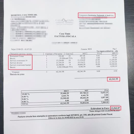 Compania de stat Salrom, care administrează Salina Praid, a organizat o petrecere de peste 12.000 de euro din bugetul statului în timp ce autoritățile căutau soluții pentru dezastrul de la Praid, arată o factură publicată de ministrul Economiei, Radu Miruță, joi, pe Facebook.