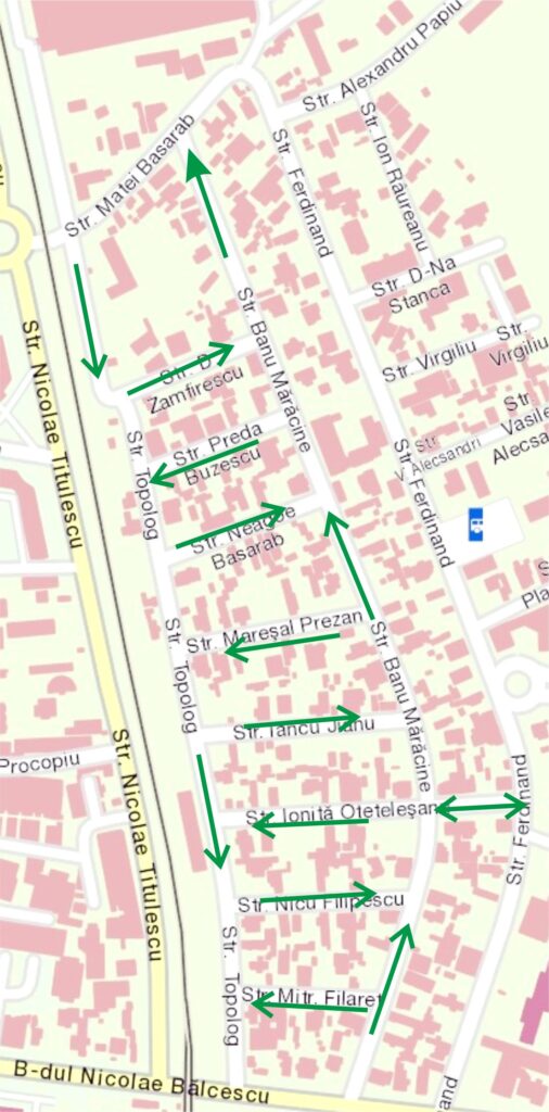 - Strada Banu Mărăcine: sens Sud – Nord (dinspre Bulevardul Nicolae Bălcescu spre strada Matei Basarab);