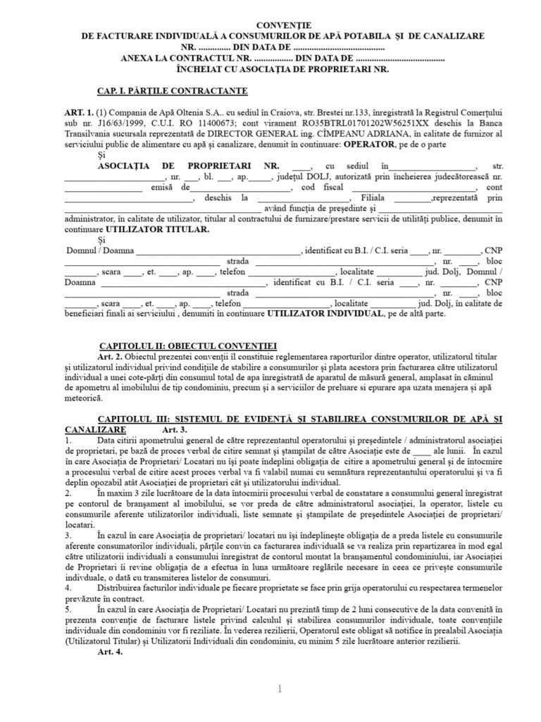 Într-adevăr, craiovenii care locuiesc la bloc pot încheia convenţii individuale cu operatorul de apă şi canal, Compania de Apă Oltenia. Important de ştiut este faptul că nu este necesar să aibă un contor de apă la uşa apartamentului. Totodată, trebuie să fie de acord toţi proprietarii din condominiul care este racordat la acelaşi branşament. Convenţiile individuale pot fi încheiate chiar dacă proprietarii au sau nu au contoare individuale scoase pe casa scării. Pentru convenţii sunt suficiente apometrele pe care toți locatarii le au în apartament, dar să fie cu citire la distanță. Totuşi, există condiţie obligatorie pentru acest contract cu operatorul de apă şi canal: să existe acordul tuturor proprietarilor din condominiu.