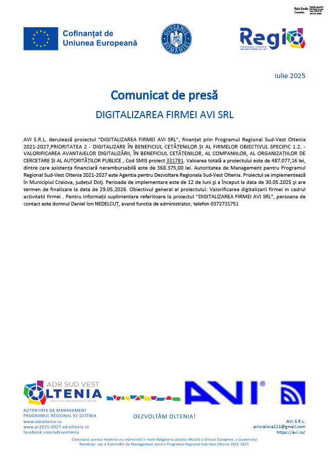 AVI S.R.L. derulează proiectul „Digitalizarea firmei AVI SRL”, finanţat prin Programul Regional Sud-Vest Oltenia