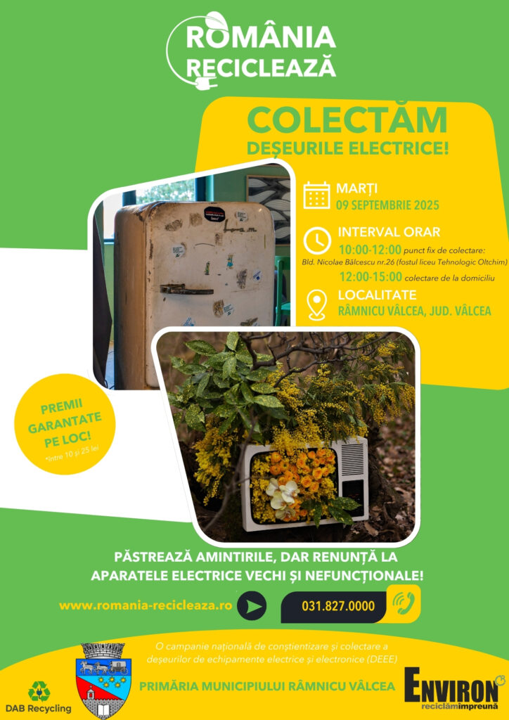Primăria Râmnicu Vâlcea organizează o nouă ediție a campaniei „România reciclează”, dedicată colectării selective a deșeurilor electrice și electronice (DEEE). Campania este derulată în parteneriat cu Asociația ENVIRON și compania DAB Recycling SRL.