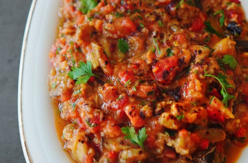 Alegem o salatieră în care punem roșiile coapte pe care le zdrobim cu o furculiță. Ardeii copți îi rupem în fâșii, lăsând clar bucăți vizibile, pentru textură. Turnăm și toată zeama lăsată de legume în oala cu capac. Pregătim pătrunjelul verde și usturoiul. Puteți pune mai mult usturoi sau mai puţin, după gust. La fel, puteți mărunți mai mult componentele.