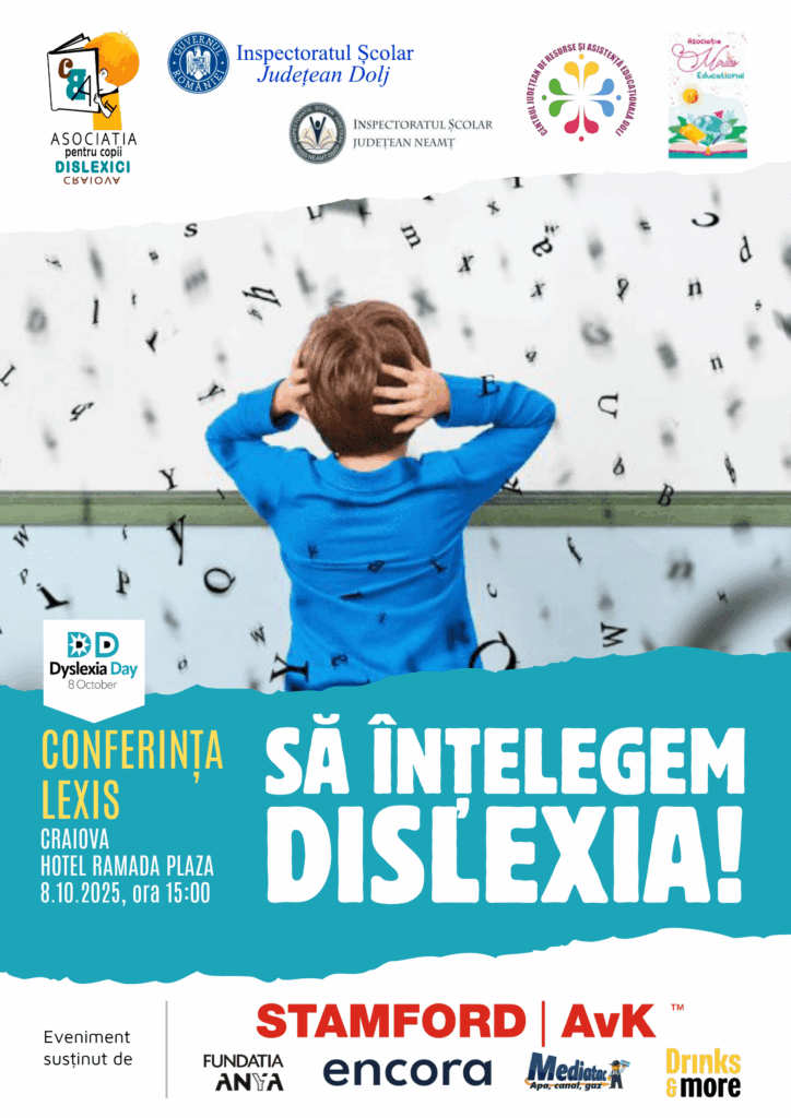 Asociația pentru Copii Dislexici Craiova, în parteneriat cu Asociația MIRIAS Educational, organizează ediția a II-a a proiectului DISLEXIA – EDUCAȚIE FĂRĂ BARIERE, eveniment ce include Conferința LEXIS, dedicată înțelegerii și sprijinirii copiilor cu Tulburări Specifice de Învățare (TSI), în special dislexia.