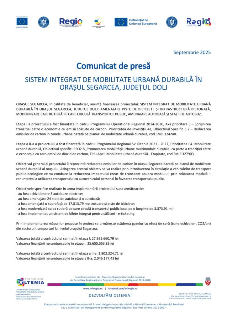 Orașul Segarcea, în calitate de beneficiar, anunță finalizarea proiectului: Sistem integrat de mobilitate urbană durabilă în orașul Segarcea, județul Dolj: Amenajare piste de biciclete și infrastructură pietonală, modernizare cale rutieră pe care circulă transportul public, amenajare autobază și stații de autobuz.