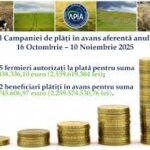 Agenția de Plăți și Intervenție pentru Agricultură (APIA) a autorizat la plată, în perioada 16 octombrie – 10 noiembrie 2025, în cadrul Campaniei de plăți în avans aferentă anului de cerere 2025, un număr de 553.545 fermieri, cu suma totală de 503.838.336,10 euro (2.559.619.384 lei).