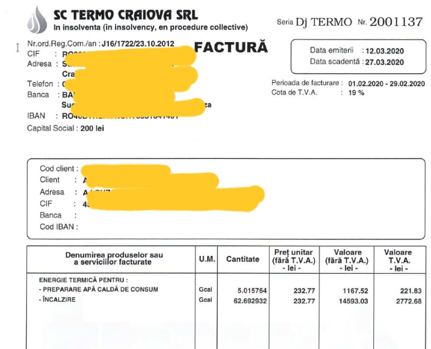 Termo Urban, furnizorul de căldură din Craiova, a emis asociaţiilor de proprietari facturile pe luna iulie, cele cu cota TVA crescută la 21%. Iniţial operatorul s-a încurcat în TVA şi a calculat facturile cu 19%. Ulterior, facturile emise incorect au fost ştornate şi au fost emise noile facturi cu TVA de 21%.