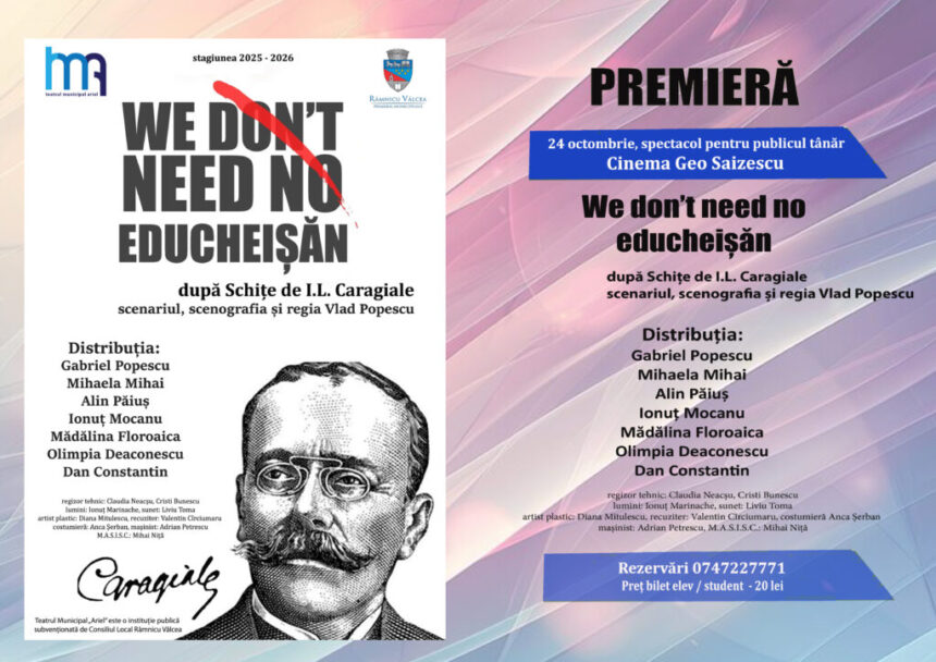 Teatrul Municipal „Ariel” va prezenta, mâine, la ora 12:00, o premieră destinată publicului tânăr la Cinema Geo Saizescu. Spectacolul este „We don’t need no educheișăn”, după „Schițe” de I.L. Caragiale, cu scenariul, scenografia și regia Vlad Popescu.