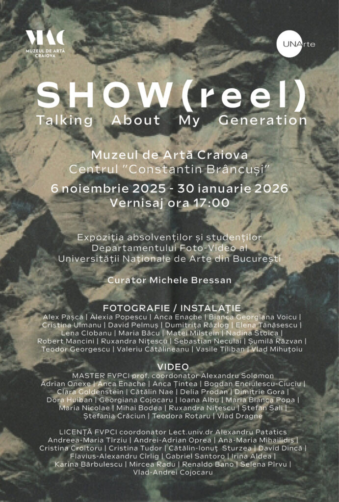 Muzeul de Artă Craiova invită publicul joi, 6 noiembrie 2025, ora 17:00, la Centrul „Constantin Brâncuși”, pentru vernisajul expoziției SHOW(reel) / Talking about my Generation. Expoziția este realizată în colaborare cu Departamentul Foto-Video al Universității Naționale de Arte din București. Expoziția, curatoriată de Michele Bressan, prezintă lucrări de fotografie și video semnate de studenți, absolvenți și doctoranzi, oferind o perspectivă asupra generației actuale de artiști. Evenimentul transformă spațiul muzeal într-un veritabil Kunstkabinett, explorând estetica și dinamica creației contemporane.