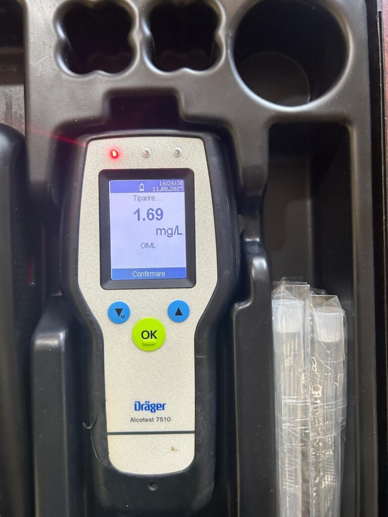 La volan se afla un bărbat de 50 de ani, din Caraula, care emana halenă alcoolică. Testarea cu aparatul etilotest a indicat 1,69 mg/l alcool pur în aerul expirat.