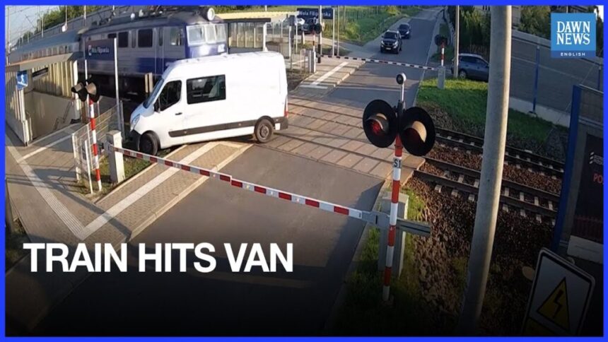 Un șofer din Polonia a scăpat ca prin minune după ce dubița sa a fost lovită în plin de un tren, pe o trecere la nivel cu calea ferată. Vehiculul a rămas blocat între barierele coborâte, iar impactul a fost surprins de camerele de supraveghere.