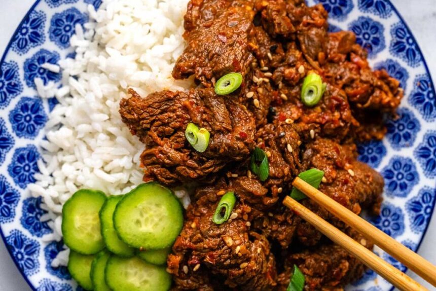 Ingrediente: 500 grame carne de vită (de preferat mușchiuleț sau mușchiuleț), felii subțiri; 1 pară sau măr, rasă fin; 1/2 ceapă, tăiată felii subțiri; 2 tulpini de ceapă de primăvară, feliate în diagonală; 2 căței de usturoi, tocați mărunt; 1 bucată de ghimbir, tocat mărunt; 2 linguri sos de soia; 1 lingură zahăr granulat; 1 lingură ulei de susan; 1 linguriță piper negru; 1 linguriță de susan prăjit; ulei de gătit; opțional, ciuperci și morcov